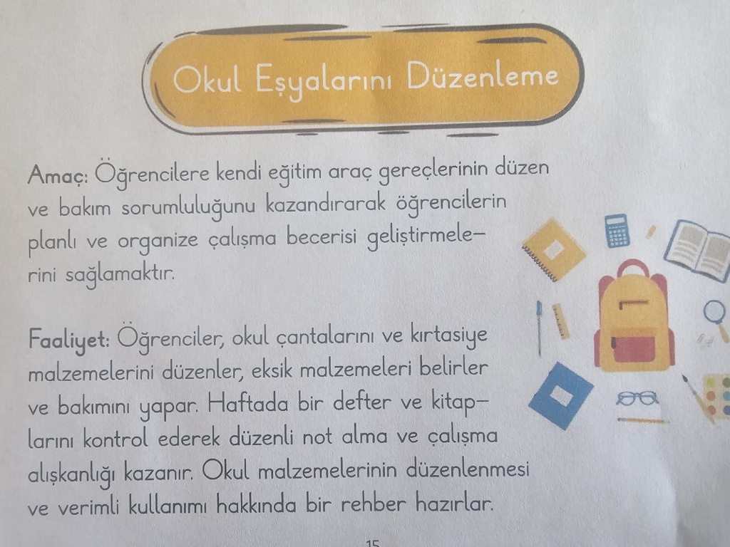 Okulumuzda"Yaşam Becerileri" projesi kapsamında okul eşyalarını düzenleme becerisini geliştirmeye yönelik etkinlikler yapıldı.